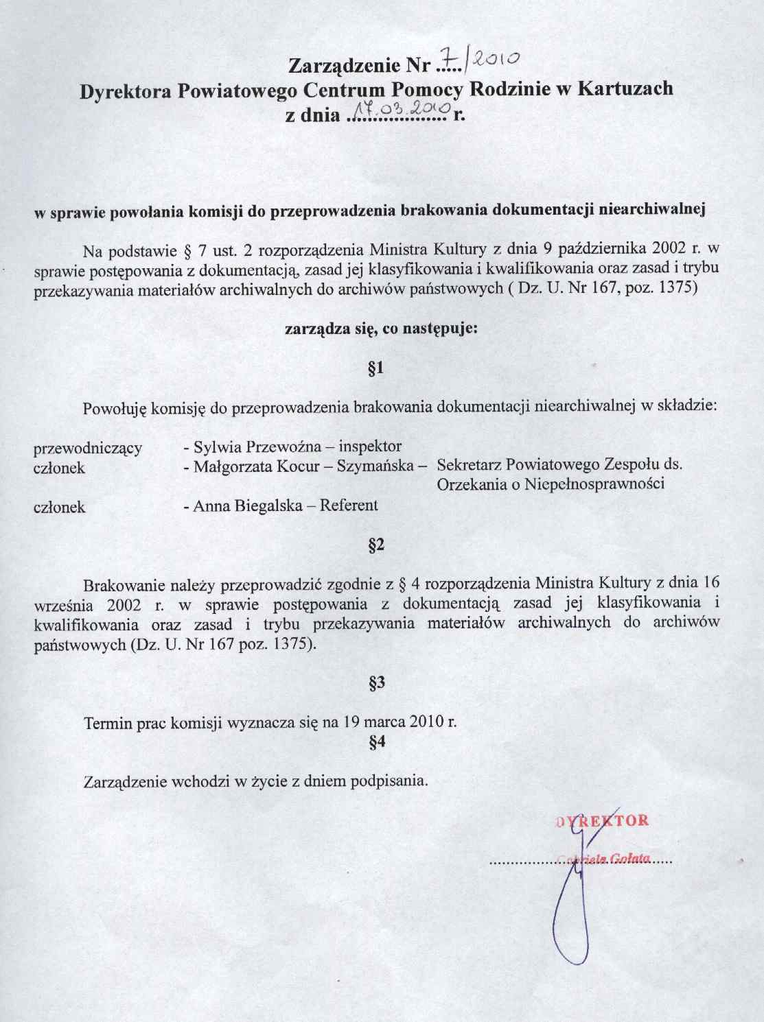 Zarządzenie nr 7/2010 w sprawie powołania komisji do przeprowadzenia brakowania dokumentacji niearchiwalnej ( 0,1 MB PDF )